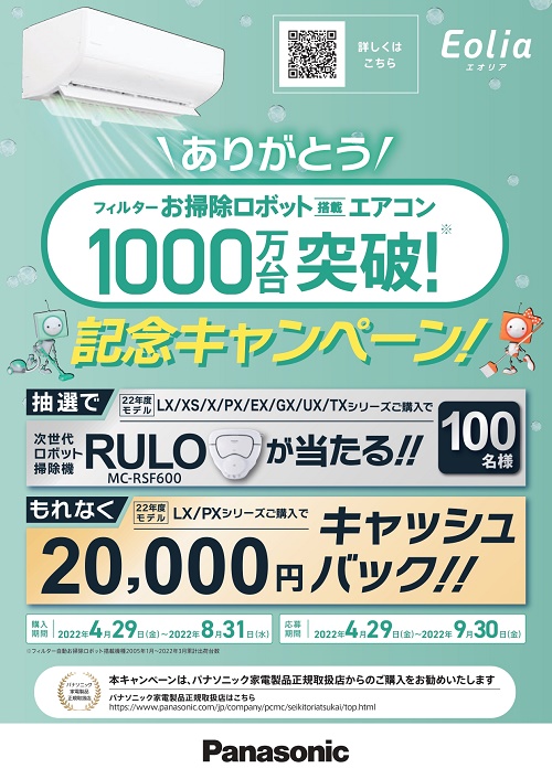フィルターお掃除ロボットエアコン1000万台突破記念キャンペーン。 お掃除ロボエアコンご購入の方に抽選で次世代ロボット掃除機「RULO」が抽選で100名様にあたる!!さらにLX/PXシリーズご購入の方にはもれなく20,000円キャシュバック!! 暑くなる前に、いちど試運転をしてみてください。少しでも気になるようでしたら早めの修理、点検をおすすめします。