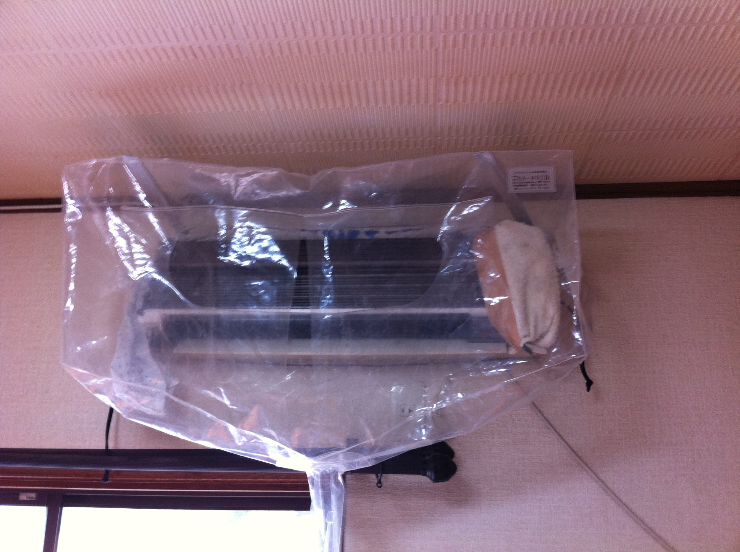室内機分解し電装部分の養生と洗浄の時の水を受ける専用カバーを設置後です。