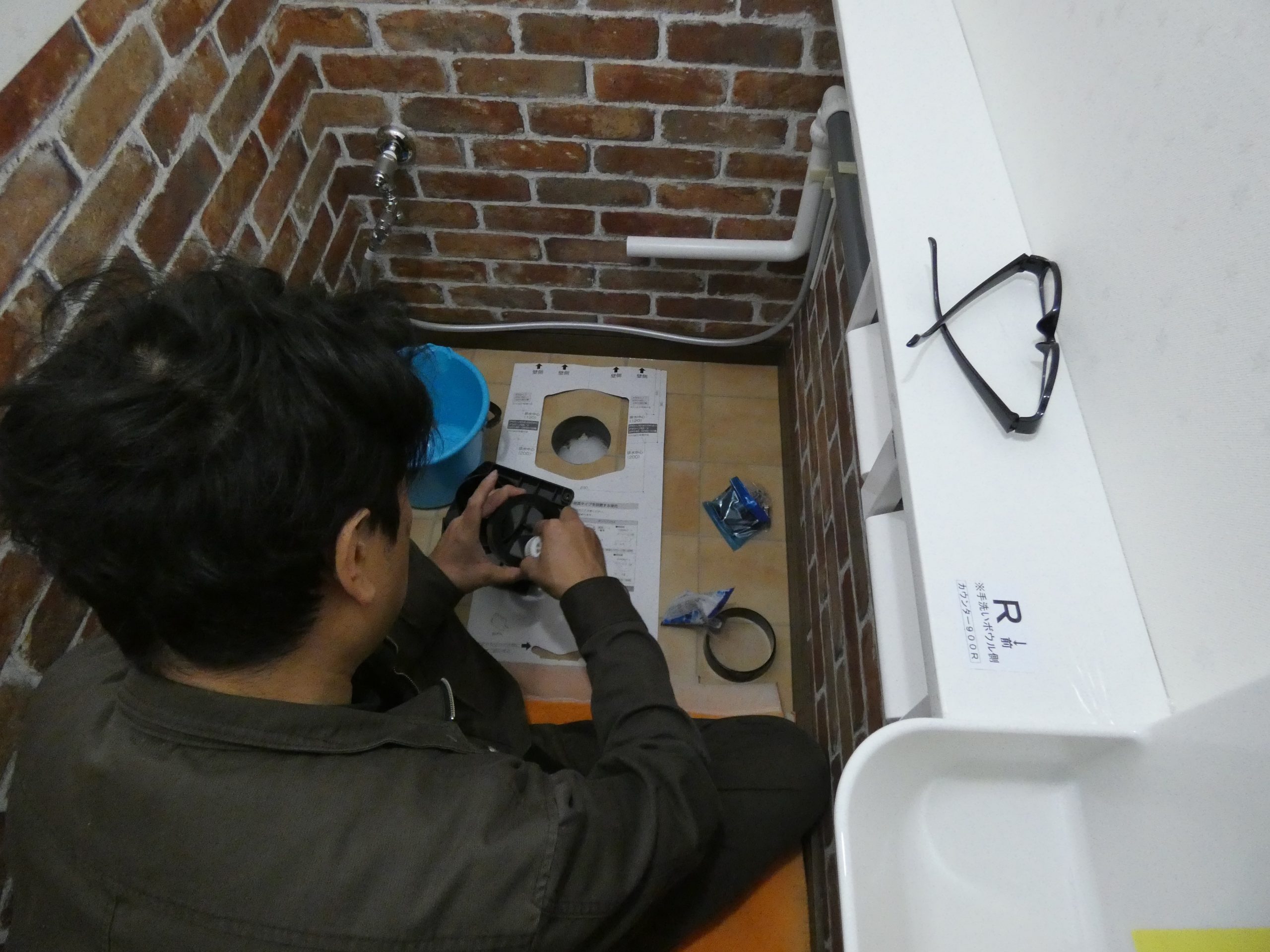 旧トイレを撤去後、アラウーノの取付作業中です。