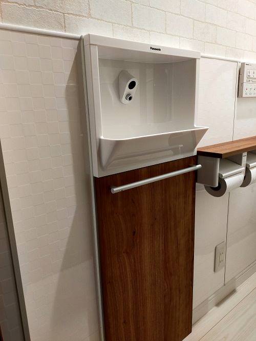 手洗いの下には給排水機器があり、隙間に収納するスペースがあります。