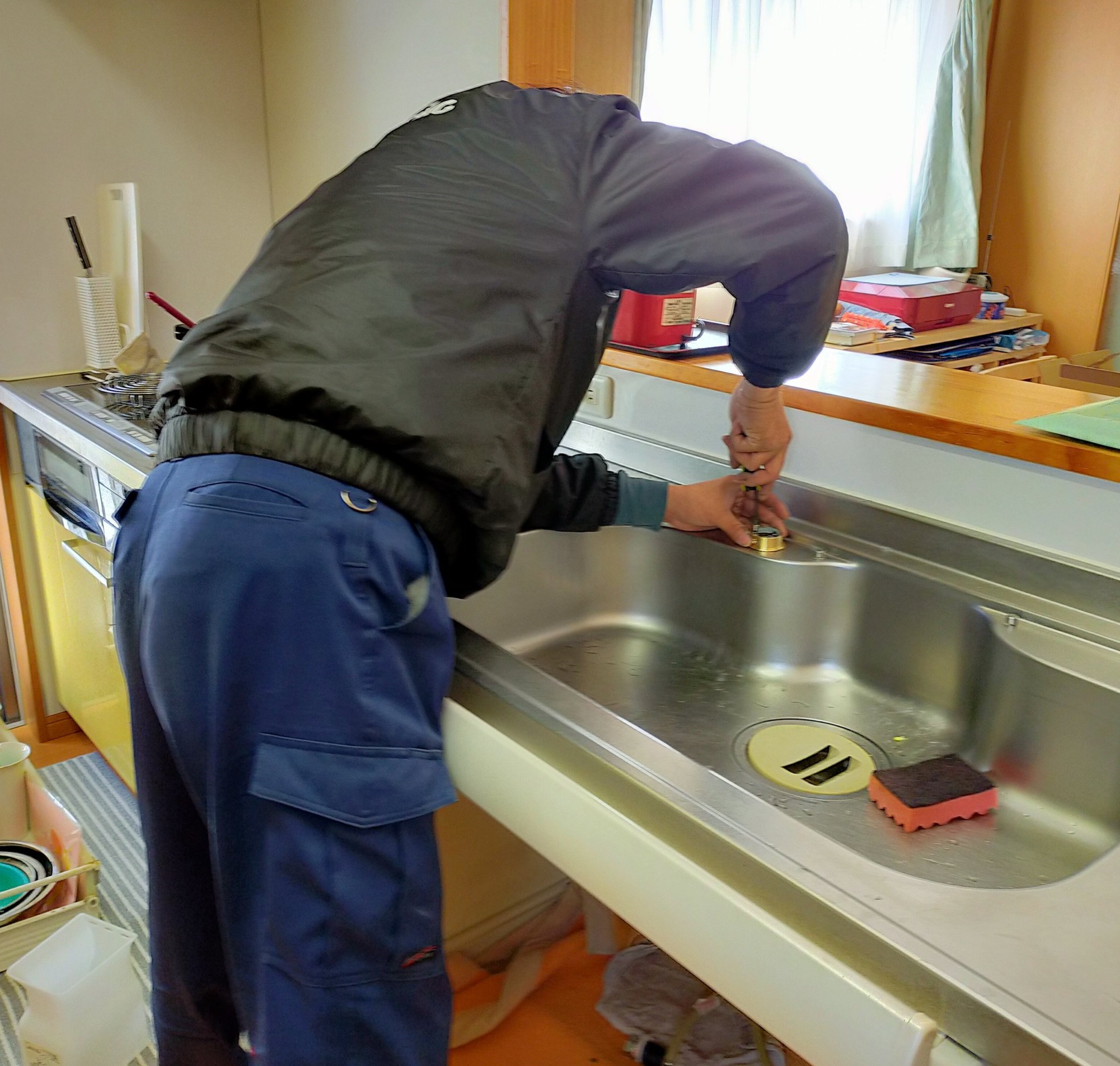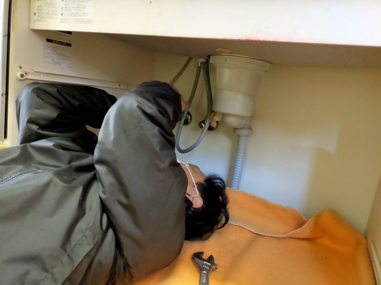 シンク下の給水配管等の接続作業。接続箇所の点検中。