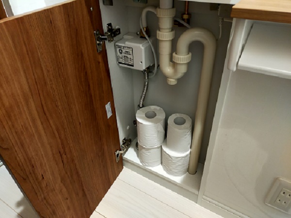 手洗いの下には給排水機器があり、隙間に収納するスペースがあります。